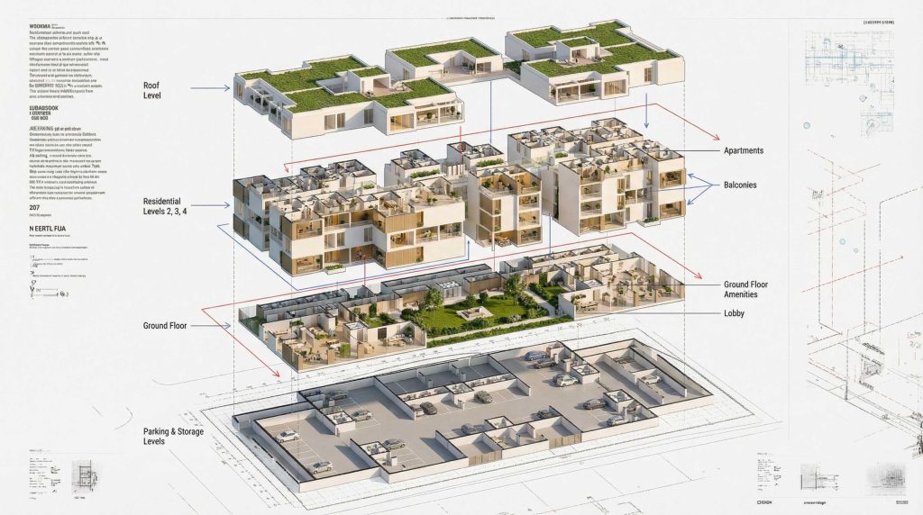 - Level -1 (The Public Realm): This level serves as the social hub of the complex. A large, central Sunken Courtyard brings natural light and fresh air deep into the structure, creating a vibrant atmosphere for restaurants, cafes, and commercial units. This depression not only creates a noise buffer from the adjacent road but also offers a sheltered, lively plaza for both residents and locals. Public parking is also conveniently located on this level.